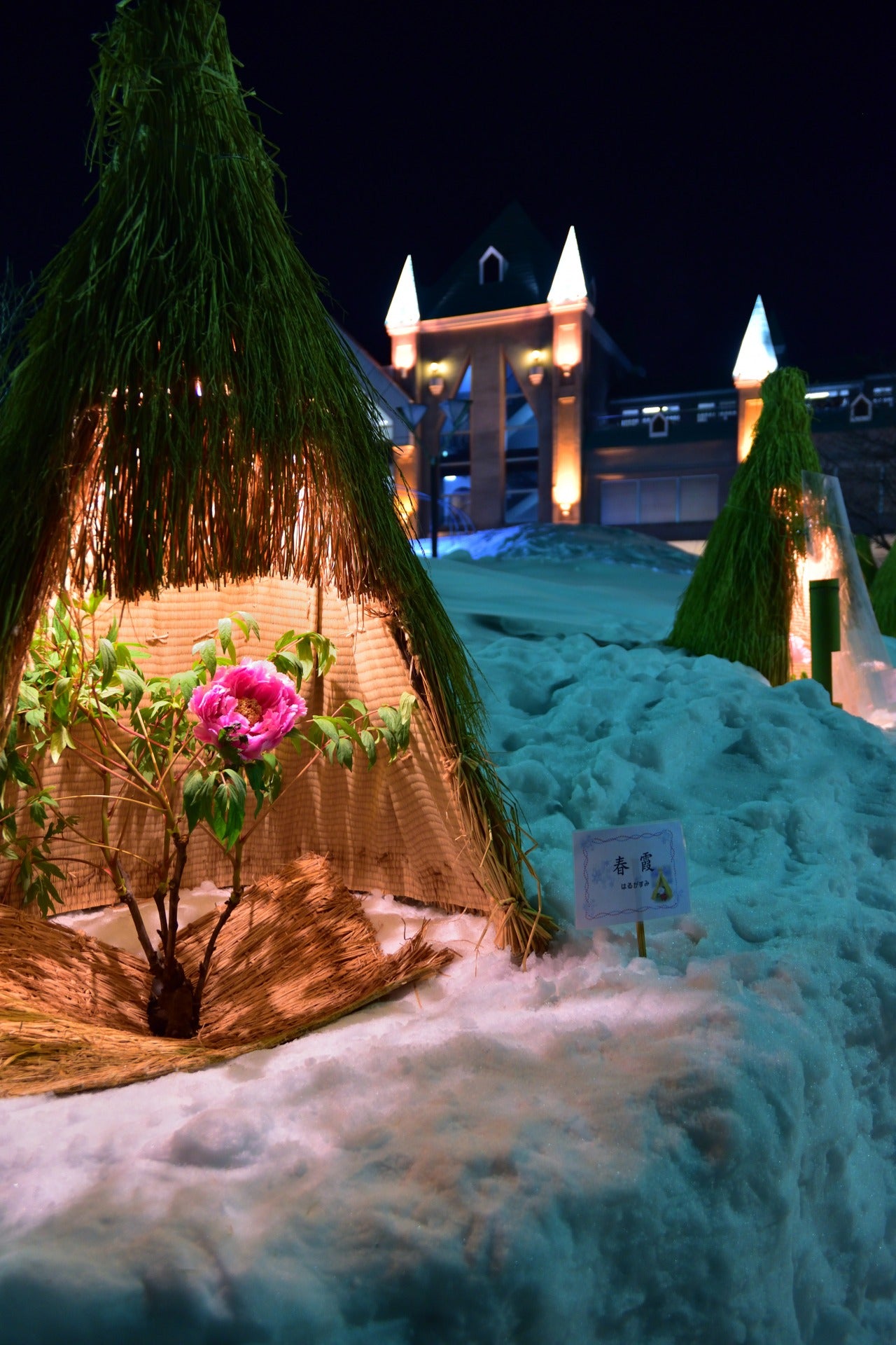 真っ白な雪景色の中、色鮮やかな牡丹が彩りを添える真冬のお花見です。