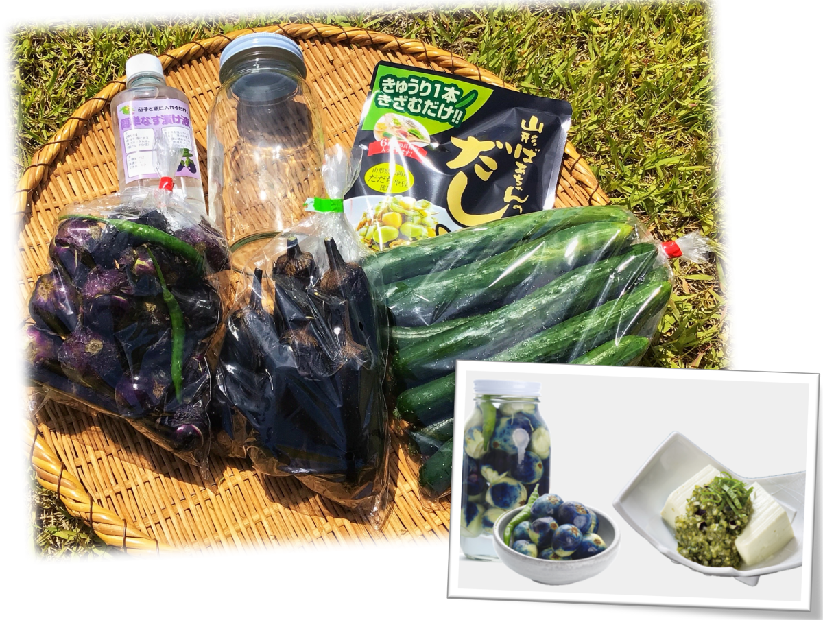 米沢の郷土野菜の薄皮丸茄子は、各家庭で透明な瓶に漬け込むため、それぞれの家庭の味となります。