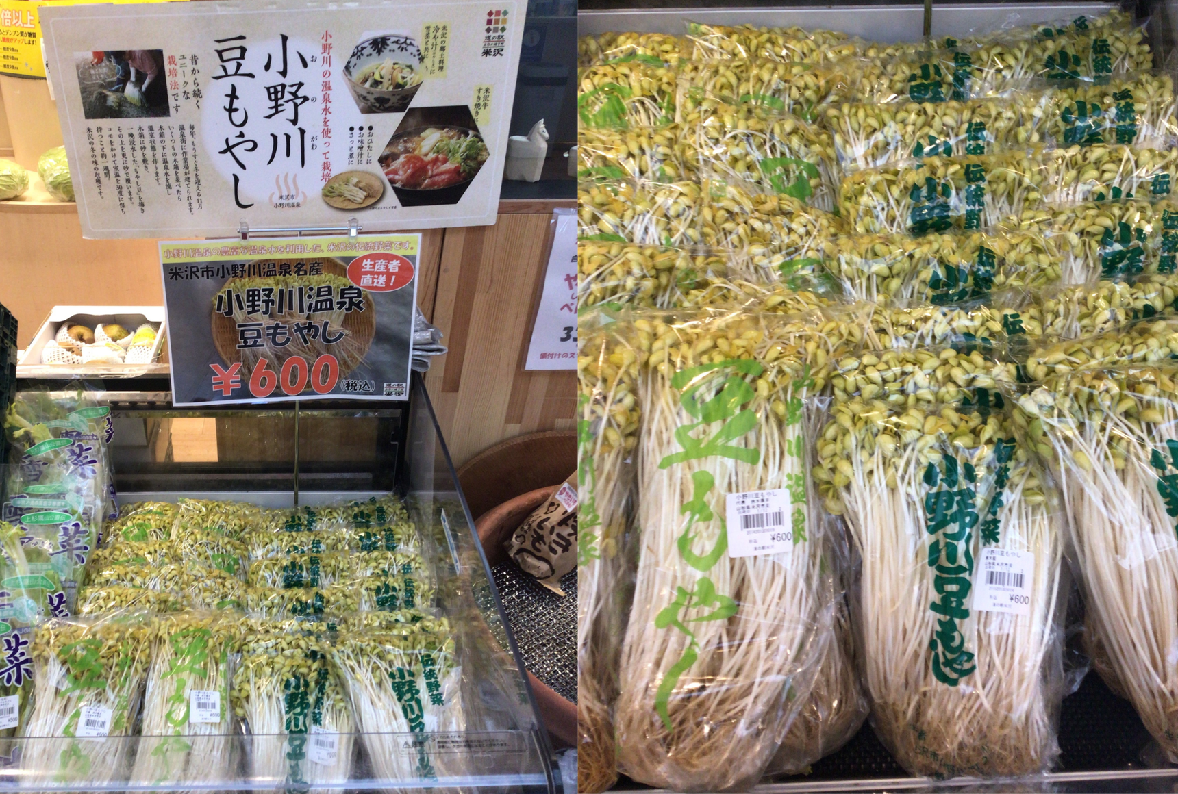 小野川豆もやしは、山形県米沢市・小野川温泉の熱を使って育てられる、長さ約30cmの特別な伝統野菜です。