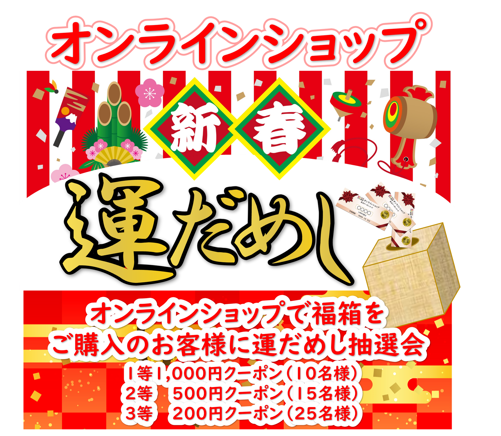 商品名の前に『福箱』と記載のある商品をオンラインショップでご購入のお客様に運試し抽選会を行います。