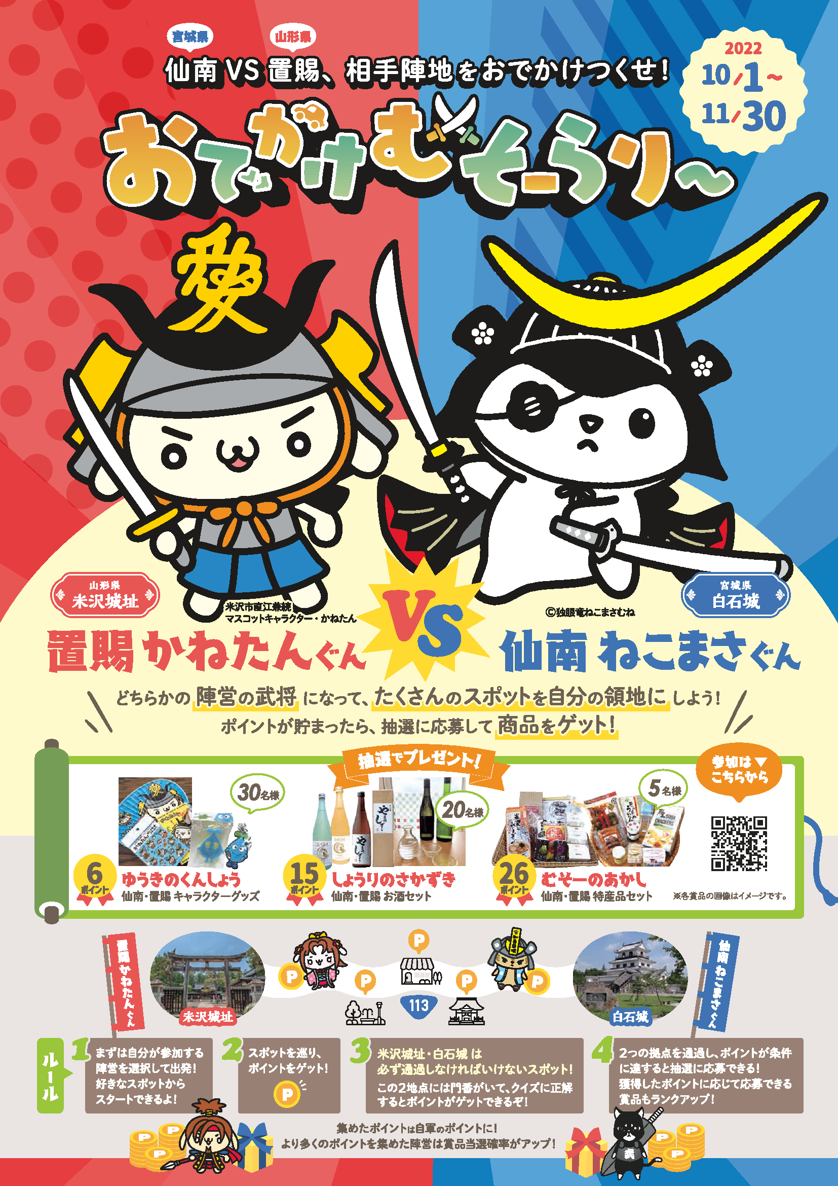 「仙南 ねこまさぐん」 と 「 置賜 かねたんぐん」のどちらかの武将になり、宮城県仙南地域と山形県置賜地域を巡るデジタルスタンプラリーです。