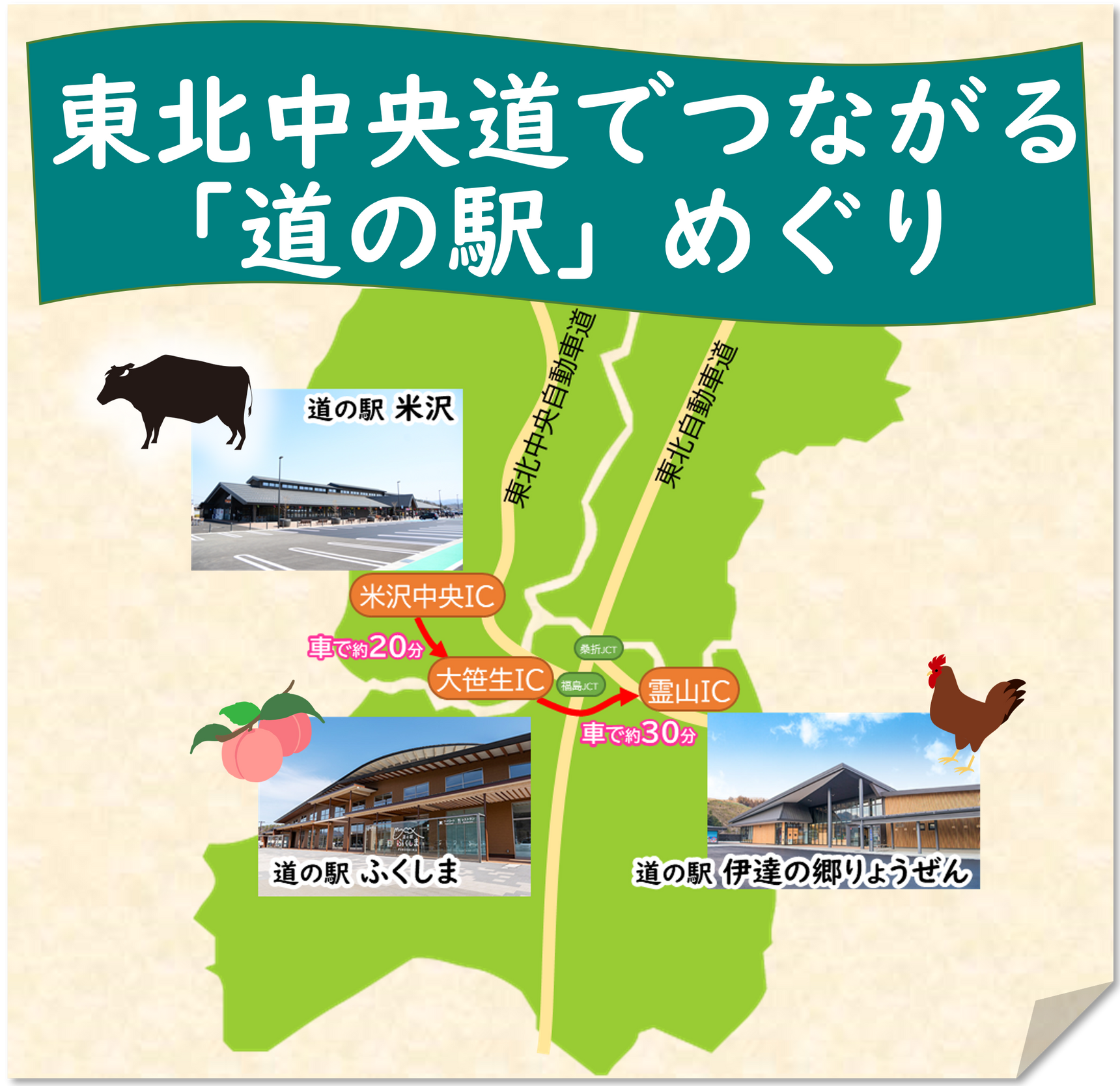 道の駅米沢の最寄IC「米沢中央IC」から道の駅ふくしまの最寄IC「大笹生IC」の区間は高速道路料金が無料となっております。