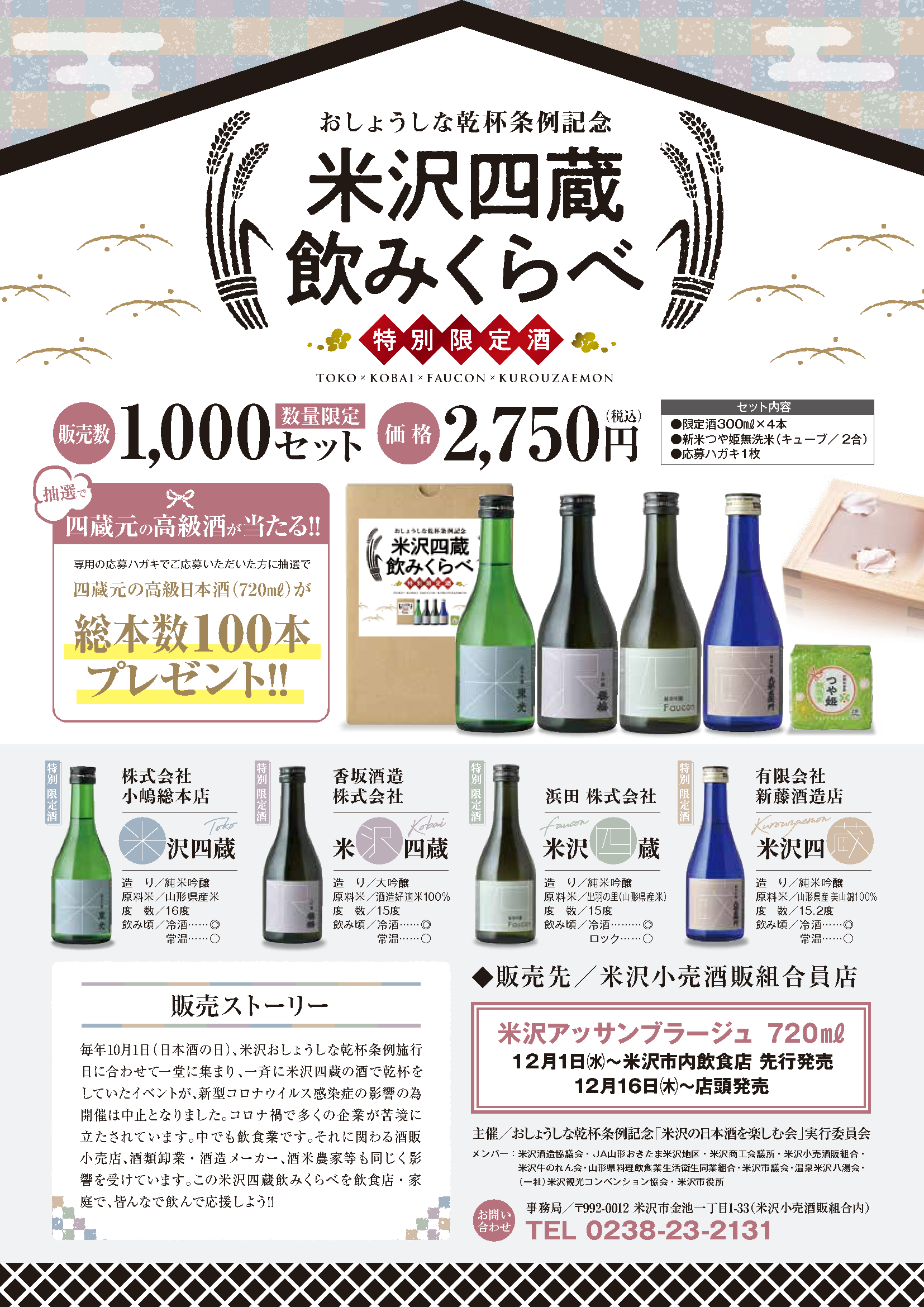 こちらのセットは、毎年10月1日(日本酒の日)、米沢おしょうしな乾杯条例施行日に合わせて一同に集まり、一斉に米沢四蔵のお酒で乾杯をしていたイベントが、新型コロナで中止となりました。