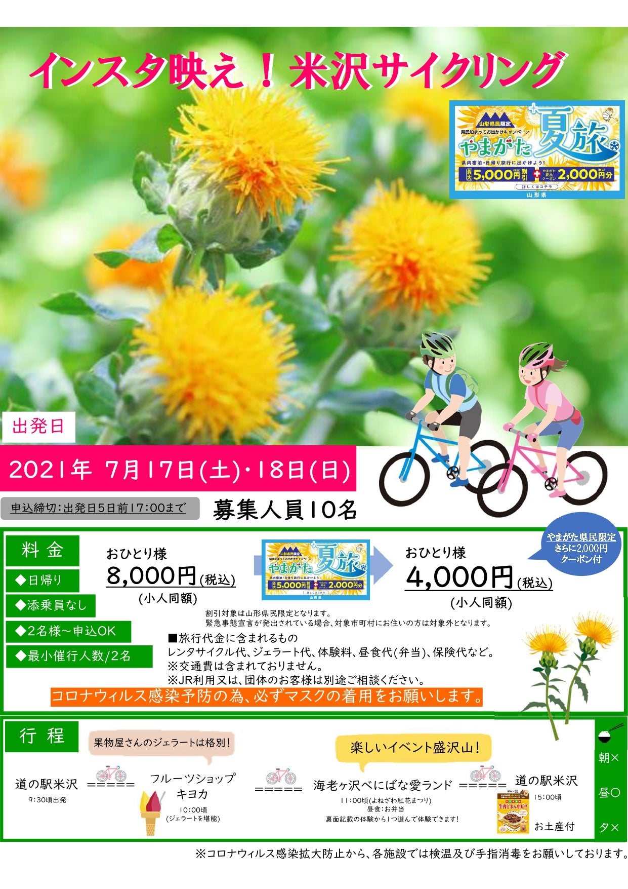 今回は、サイクリングで米沢をまわるセット商品となっております。フルーツショップキヨカさんのジェラートで涼んでから、おまつりに参加し紅花体験いかがでしょうか?