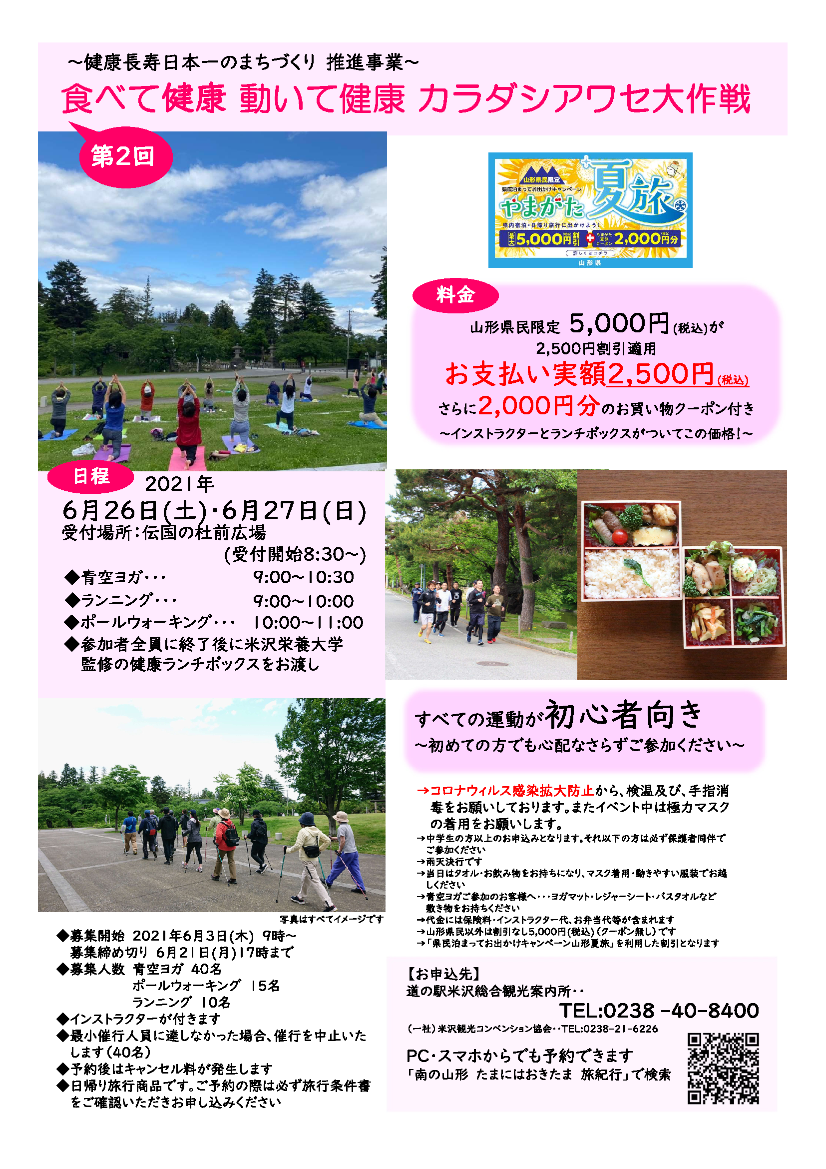 ホットヨガ&メディカルフィットネス ジル米沢さんがインストラクターとなり、青空ヨガ・ポールウォーキング・ランニングをそれぞれ選択できる、健康を楽しめるプランとなっております