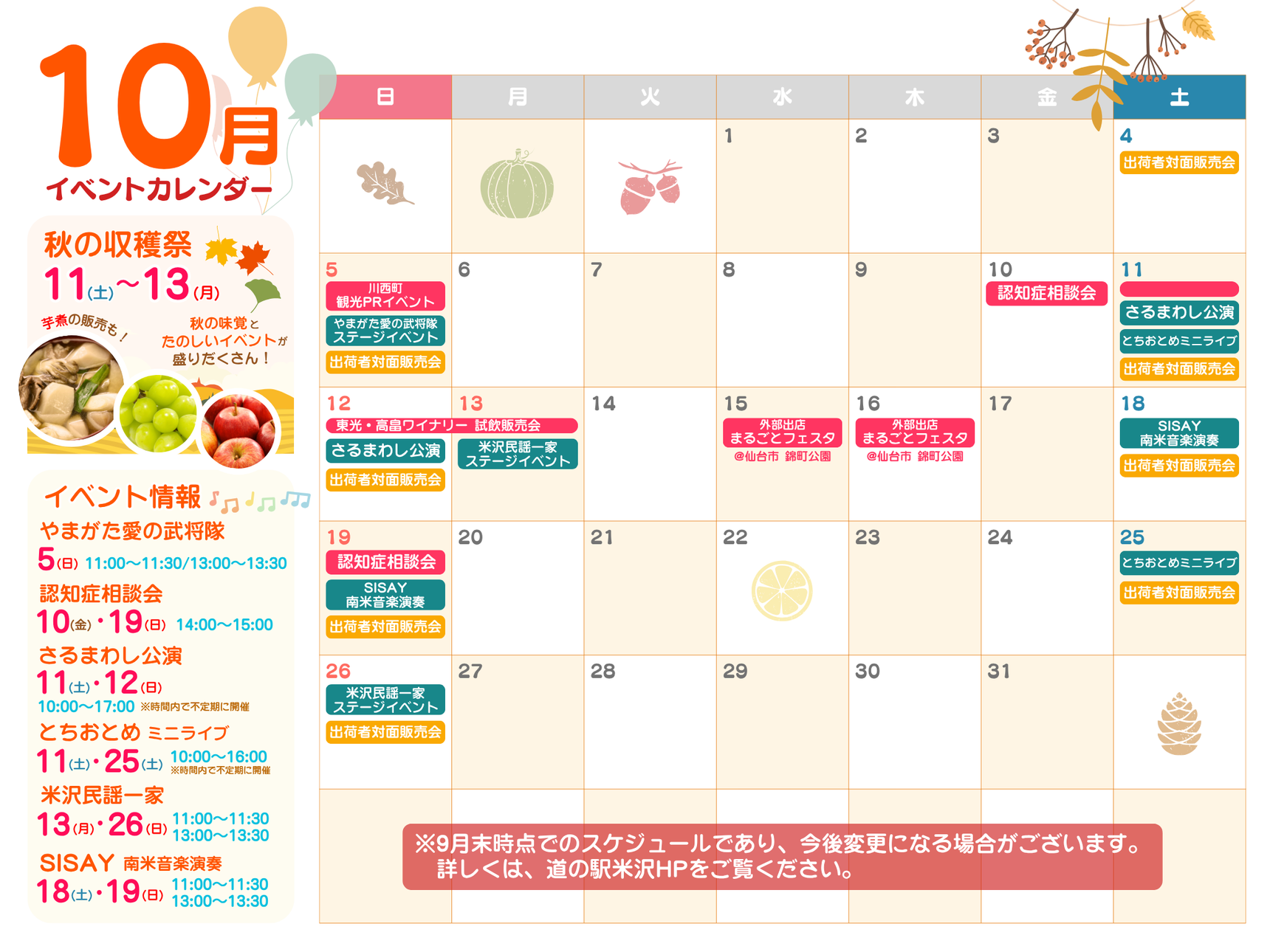 また、10月11日()~13日()には秋の収穫祭を開催します!山形の秋の味覚芋煮の販売もございます🍁